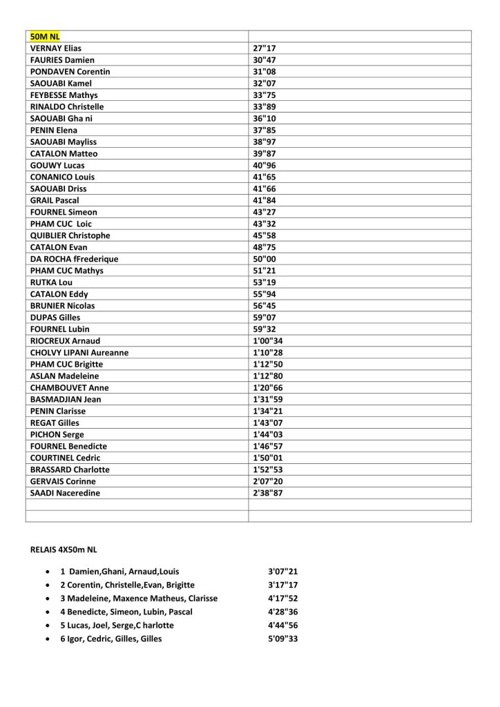 En matinée, une vingtaine de jeunes débutants issus de notre école de natation se sont mesurés sur des épreuves de 25 mètres. Cette manifestation a permis à notre entraîneur Denis d’identifier les nageurs présentant des aptitudes prometteuses en vue de leur intégration au groupe de compétition.