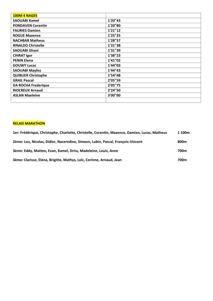 Quatre relais marathon ont clôturé cette journée sportive. Ces équipes de huit nageurs se sont relayées pendant quinze minutes, la victoire revenant à celles ayant parcouru le plus grand nombre de longueurs.